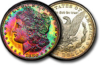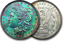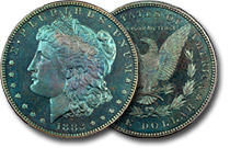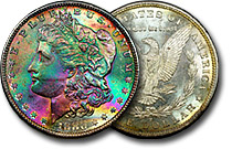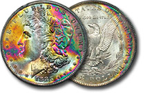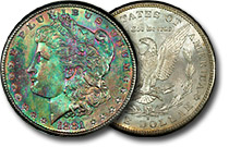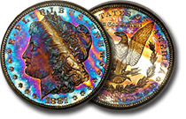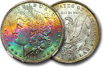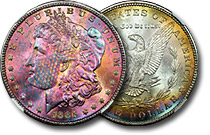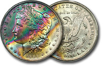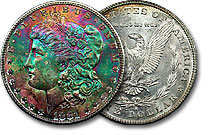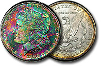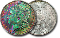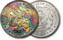 This is one of the top 50 toned Morgan dollars in existence. As with all the top toners, this beauty has been named Scrunchie. Deep bowl luster is ablaze with all of the rainbow colors in a myriad of patterns. ... |