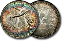 A wide band of vivid blue, green, and auburn tinted with a touch of purply-pink (the good kind) encircle the obverse of this intensely lustrous Pan Pac Commemorative. The reverse has the typical sliver of color closely following the rims. Beautiful Coin!... |
