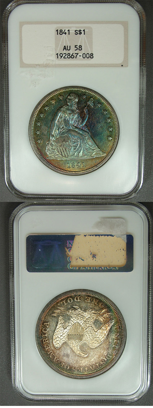 1841 $1 NGC AU58 Monster Rainbow Toned Seated Dollar