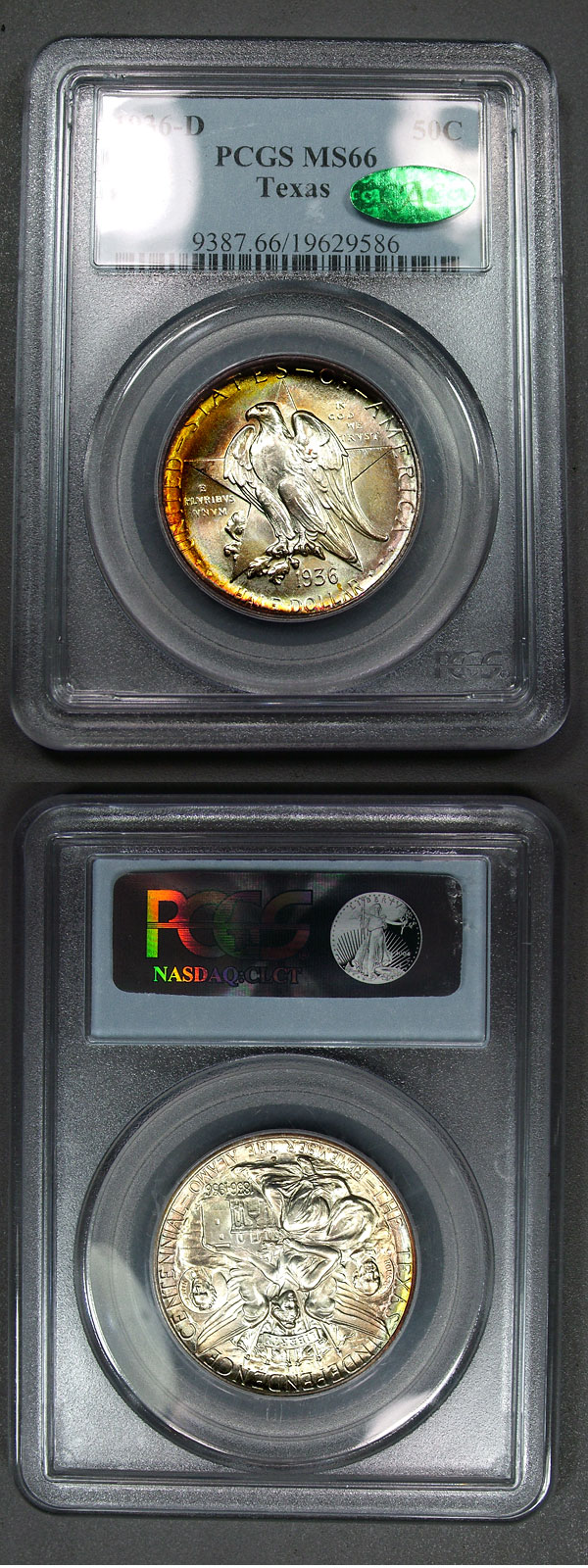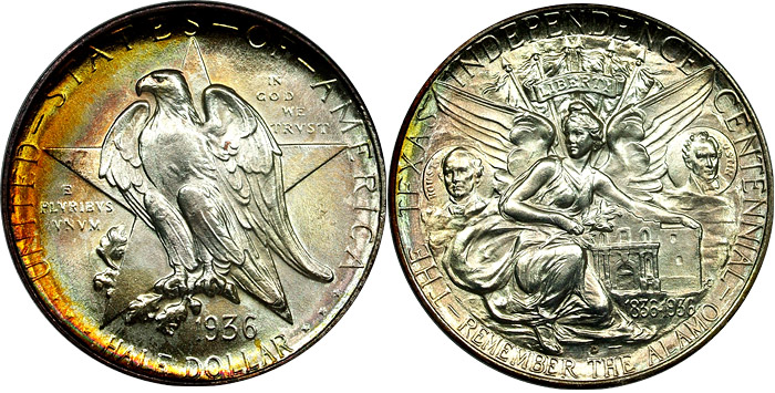 1936-D 50C PCGS MS66 Rainbow Toned Texas Commem