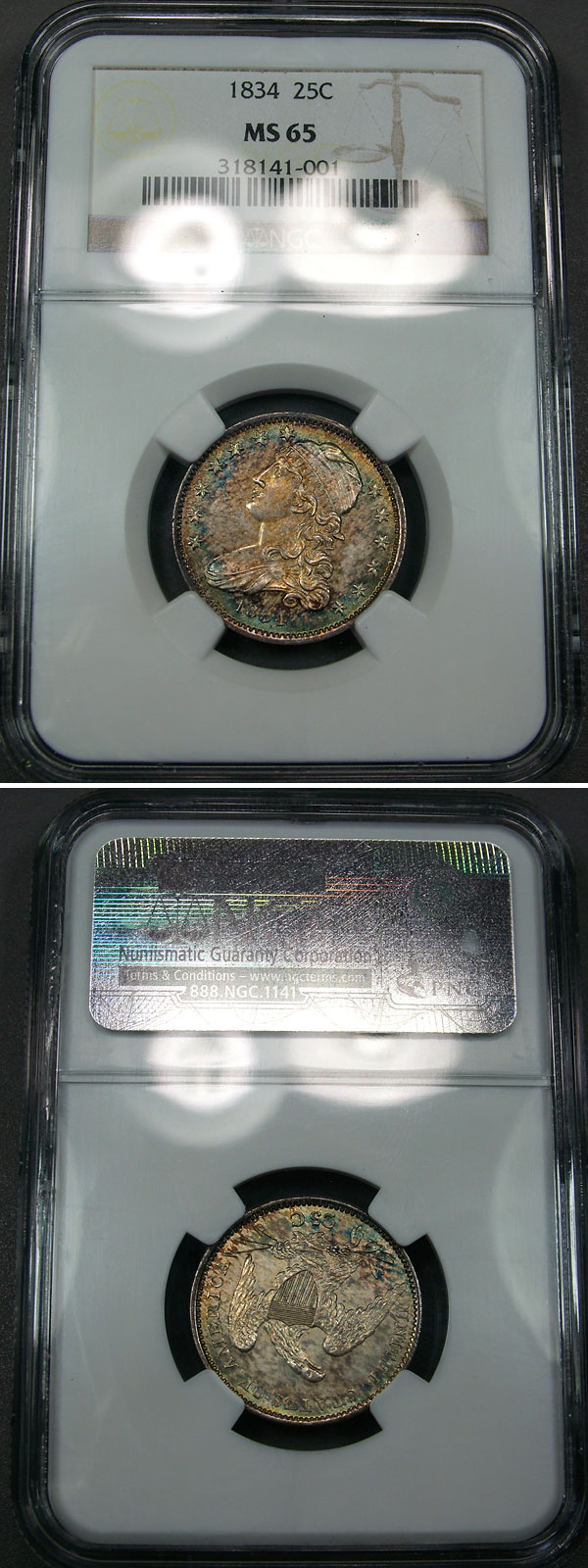 1834 25c NGC MS65 Lustrous Toned Gem Capped Bust Qtr.