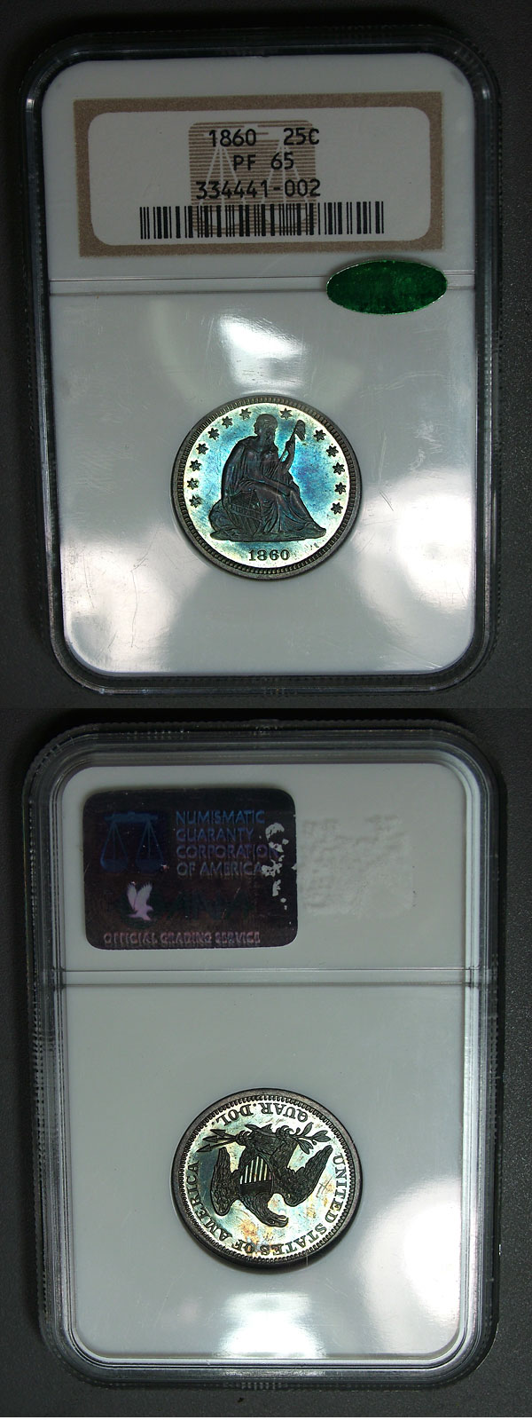 1860 25c NGC PF65 Beautifully Toned Proof Seated Qtr. - CAC