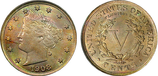 1908 5c PCGS MS62 Stunningly Toned Liberty Head Nickel