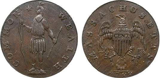 Lovely 1788 Massachusetts Cent R.3a. Well struck devices balanced over nicely preserved planchet. Chestnut browns. The Massachusetts Authurized Issue Coppers were the first coins bearing the denomination "cent" A lovely coin and neat piece of US numismatic history.