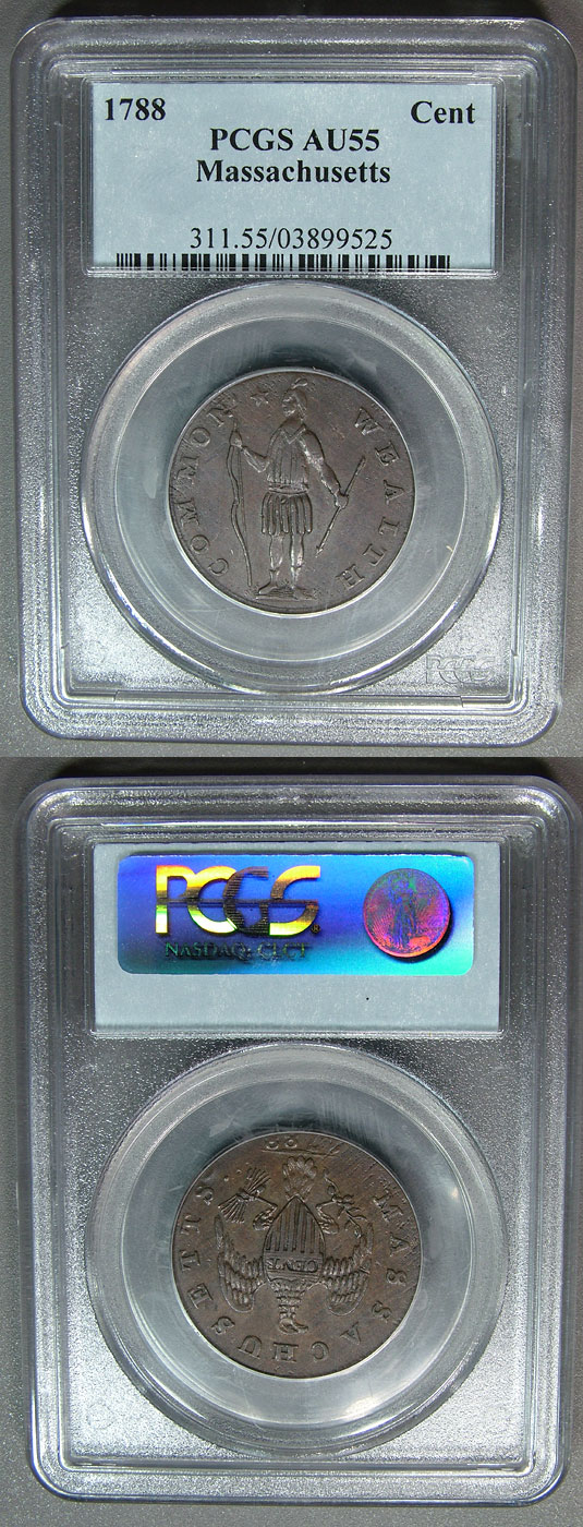 1788 1c PCGS AU55 Massachusetts Cent - R.3a