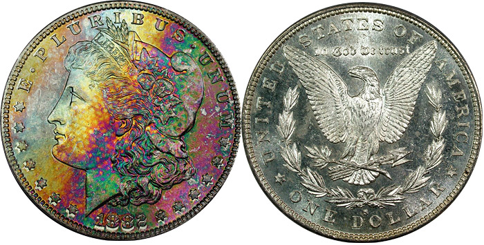 View the largest gallery of high-end and Monster rainbow toned Morgan dollars, an informational guide on how to tell natural vs. artificial toning, learn to price toned Morgans, view auction results of rainbow Morgans, and view what characteristics to look for in high-end toned rainbow Morgan dollars.