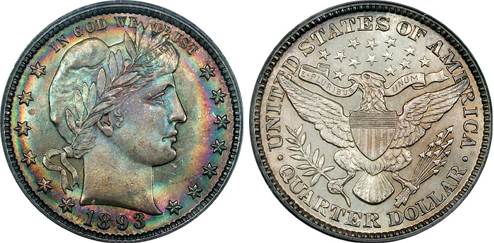 Pop 1/0. Finest Known 1893 Barber Quarter in Existence. This amazing Barber quarter has rich color extending in bands across the obverse beginning with deep blue-green in the center and extending out to the rims in a thick rainbow. The surfaces are more than pleasing with pristine surface preservation and good luster. The reverse is very lightly toned and also exhibits a pristine surface preservation.
