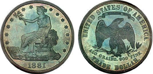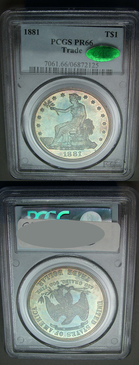 Lovely toning graces this 1881 $1 PCGS PR66 Proof Trade Dollar designated "CAC" Heavily frosted and keenly struck motifs are harbored by wonderfully mirrored fields. Superb pale pastel toning of green, blue and gold gently brush throughout. A fabulous looking and highly difficult piece to secure in such a lofty state of preservation.