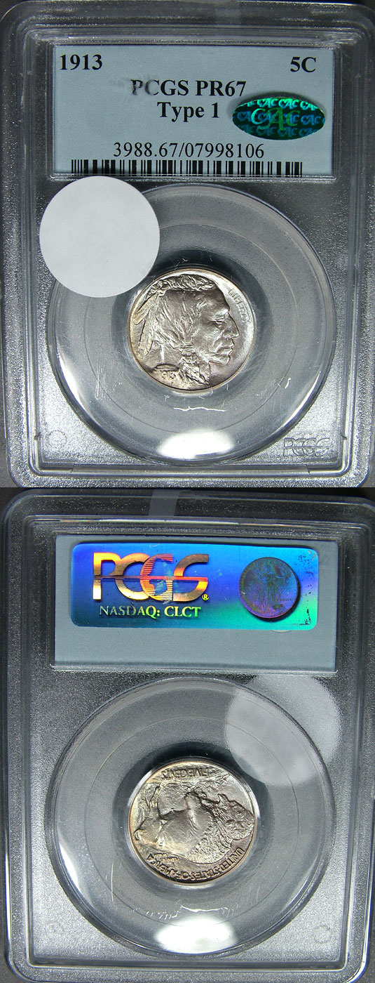 1913 5c PCGS PR67 Type I Toned Proof Buffalo Nickel - CAC