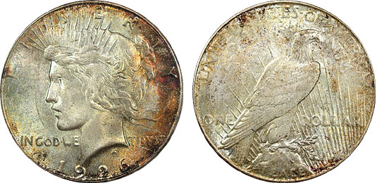 Toned in attractive original earthy tones with emerald green and magenta joining the party on the right of the obverse. Gem toned Peace dollars are not a common occurrence and when they are found, they are usually not what I would call attractive. This one is pleasing and full of eye appeal and lacking the typical distracting haze that many of the available naturally toned Peace dollars exhibit. 1926-S Peace dollars in Gem typically sell in the $800 range but demand higher premiums for attractive toning which is rarely found on Peace dollars.