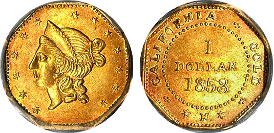 Choice 1853 PCGS AU58 One Dollar Territorial Gold Fractional BG-530 is a perfect AU with just a touch of rub on the high points. Orange peel toned and lustrous this coin is PQ and won't spend much time on the available page. Hurry on this amazing piece of history.