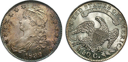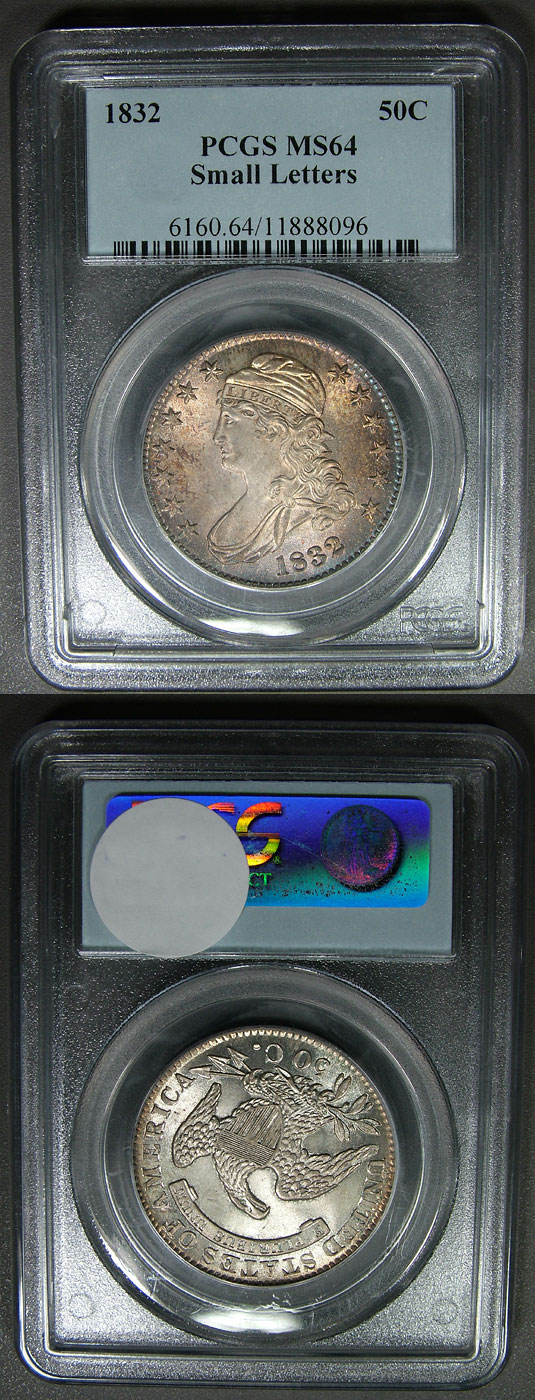 Stunning 1832 50c PCGS MS64 Capped Bust Half - Small Letters, pleasing color and white collectors the same?! Blast white you crave? Check the reverse of this gorgeous Bust Half. Blasty, highly lustrous and a hammered strike that leaves most MS64 examples in the rear view mirror! Admire color I ask? Witness the obverse of this angel. Boldly struck, swimming in luster and toned in a beautiful rusted rose and subtle gold patina. This coin is beautiful no matter which side of the fence you reside. Incredible eye appeal to say the least!