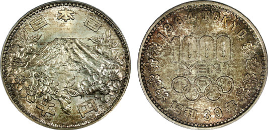 This coin features Cherry blossoms, the Olympic rings, 1 000 yen, with the legend “1964 Tokyo” and a legend in Japanese meaning “year 39 of the reign of Showa”.