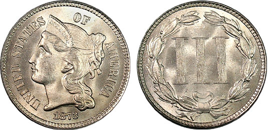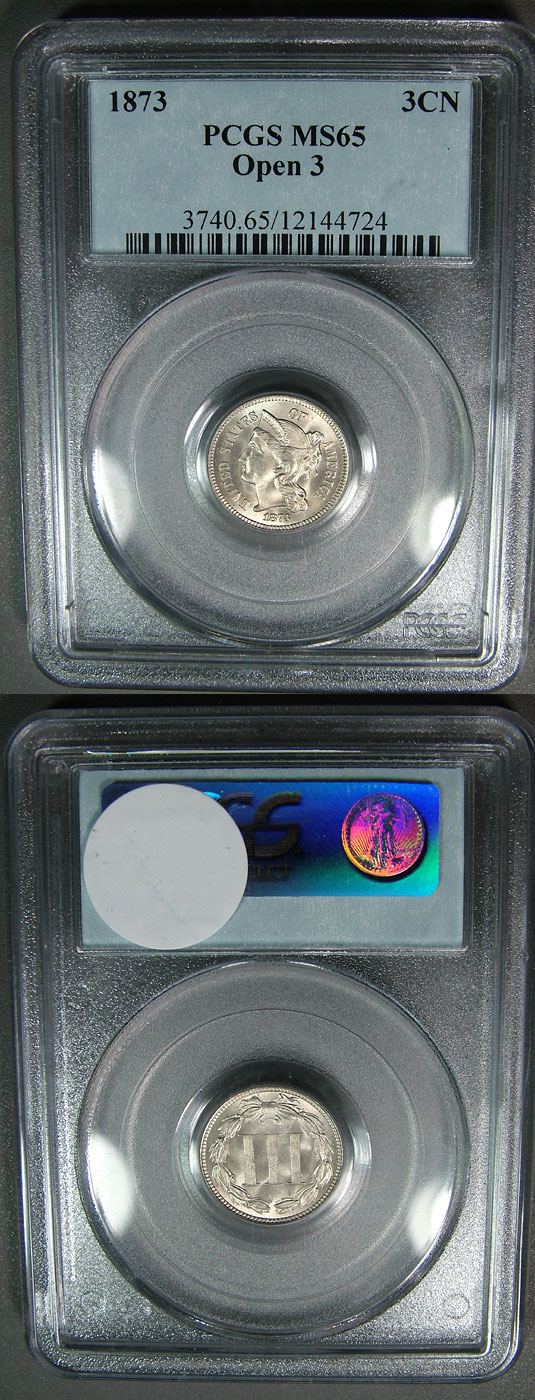 1873 3cn PCGS MS65 Lustrous PQ Three Cent Nickel - Open 3