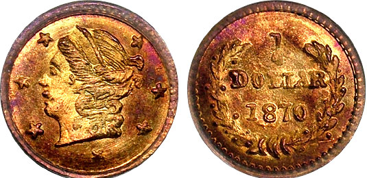 Beautiful 1870 Territorial Gold Fractional BG-808 exhibits satiny smooth orange peel fields with lovely plum hues at rim. Fields are well preserved and problem free. Devices well struck with terrific eye appeal throughout. Scarce in such a lofty state.