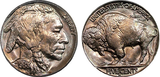 This fantastic lustrous buffalo nickel is toned over with light shades of lavender and peach. This is a very bright and clean buffalo nickel with booming luster and free of visible marks that distract from the eye appeal of this beautiful and affordable Buffalo nickel.