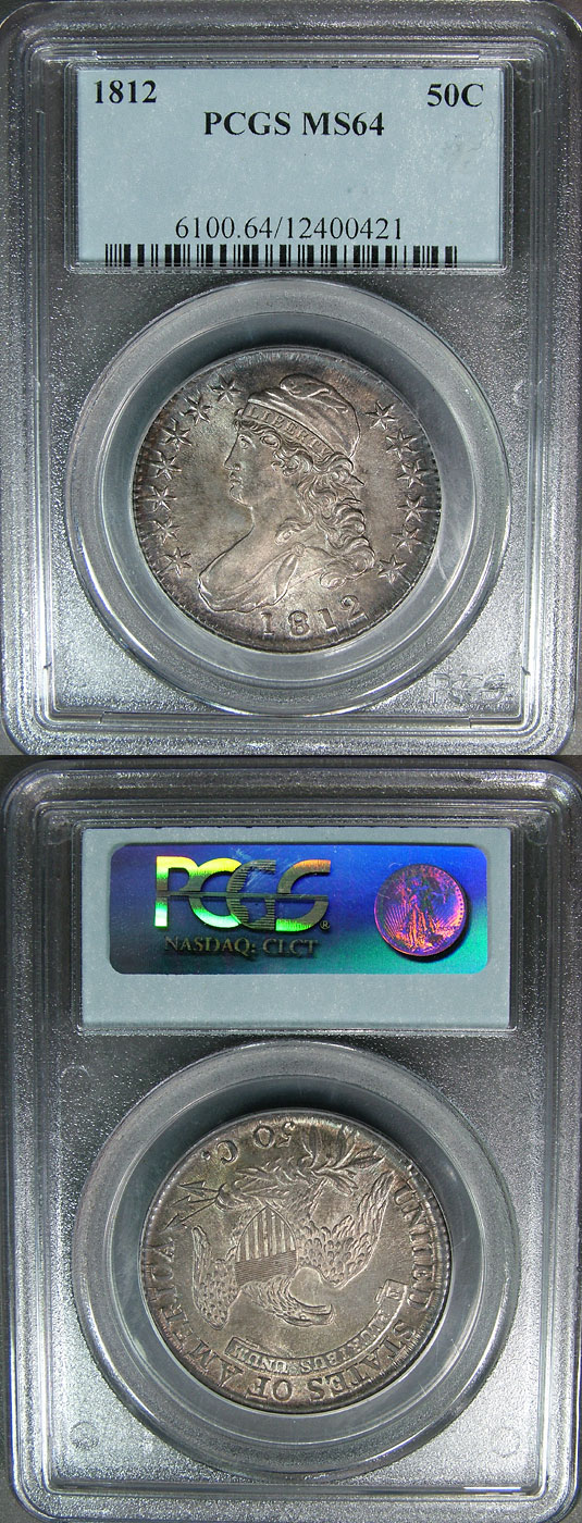 Outstanding 1812 50c PCGS MS64 Capped Bust Half Dollar o-110a drips with appeal! Nice gunmetal steel base with subtle pastel blue and rose tones. Highly lustrous with nice cartwheel effect. A wonderful example of a gorgeous BU early half dollar.