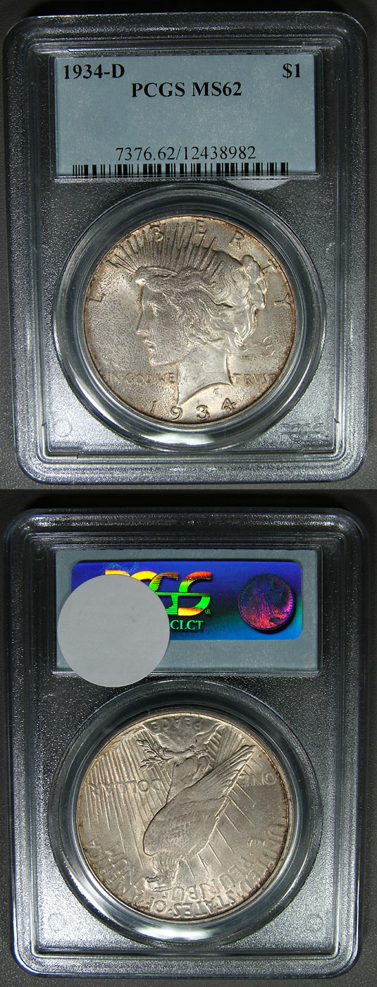 Nice 1934-D $1 PCGS MS62 Peace Silver Dollar exhibits satin luster. Well defined central devices. Specs of gold tone most notable at rims. Mottled bronzed flakes of tone are noted on obverse. Nice even satin luster.