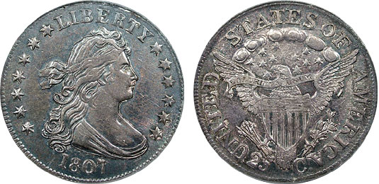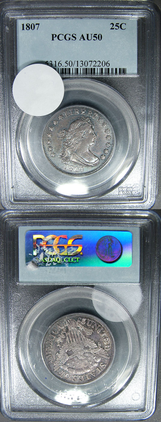 1807 25c PCGS AU50 PQ Toned Draped Bust Quarter