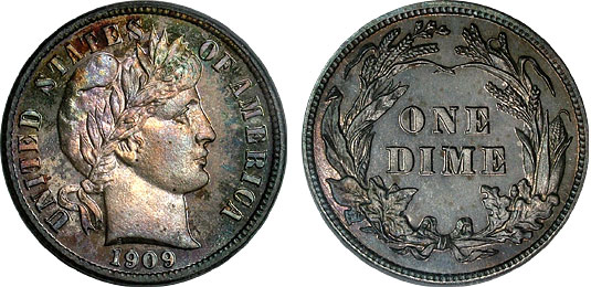 Rainbow iridescence splashes throughout on this stunning 1909 Proof Barber Dime. Sharply struck devices are centered about problem free fields gleaming in satin luster. Tremendous eye appeal. A lovely coin for the collector desiring attractively toned coins..