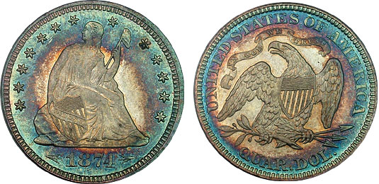 Unbelievably beautiful gorgeously toned 1874 Proof Liberty Seated Half. This coin is the definition of the word WOW!! Devices are frosty and superbly struck. Fields are ablaze in orange and gold tones extinguished at the rims in an icy blue and sea green halo of perfection!