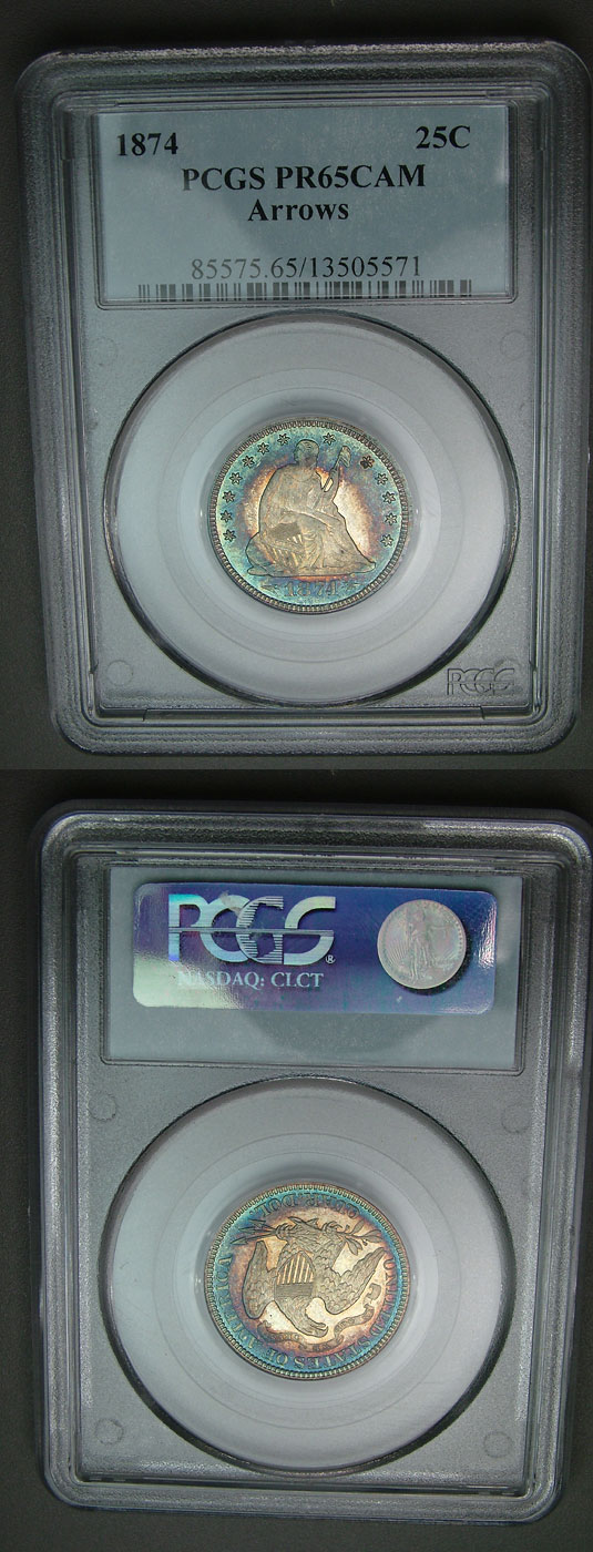 1874 25c PCGS PF65 CAMEO Arrows Seated Quarter - WOW!