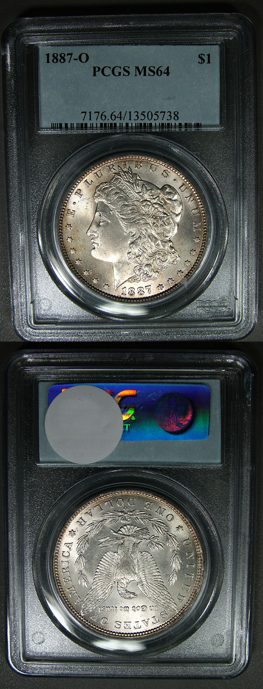 Lustrous 1887-O $1 PCGS MS64 Morgan Silver Dollar is boldly struck. Quite appealing. Blast white design elements are bold and well defined. Fields are well preserved. Subtle gold hues are noted towards rim. Highly lustrous cartwheel effect. A lovely example indeed.