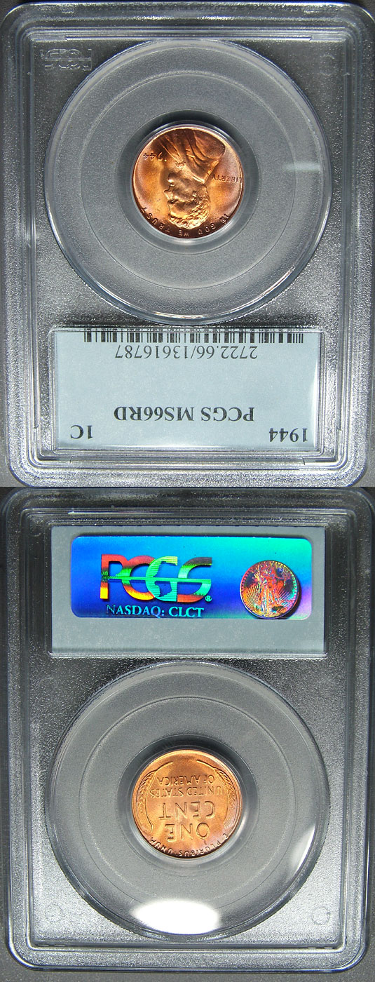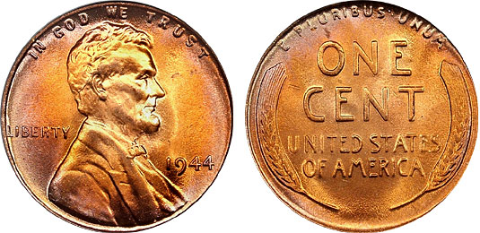 1944 wheat penny from a never opened roll. Peach toning around the edges of the obverse and on the upper left side of the reverse. Very lustrious.