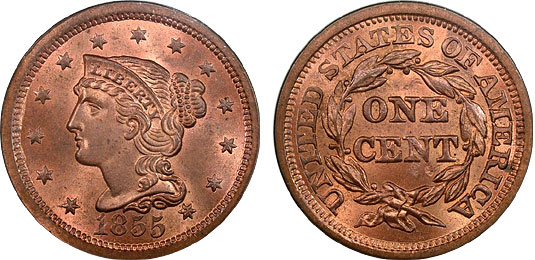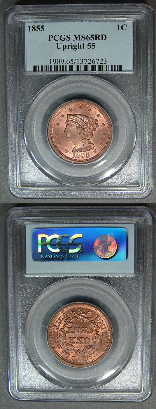 1855 1c PCGS MS65RD Coronet Head Cent - Upright 55