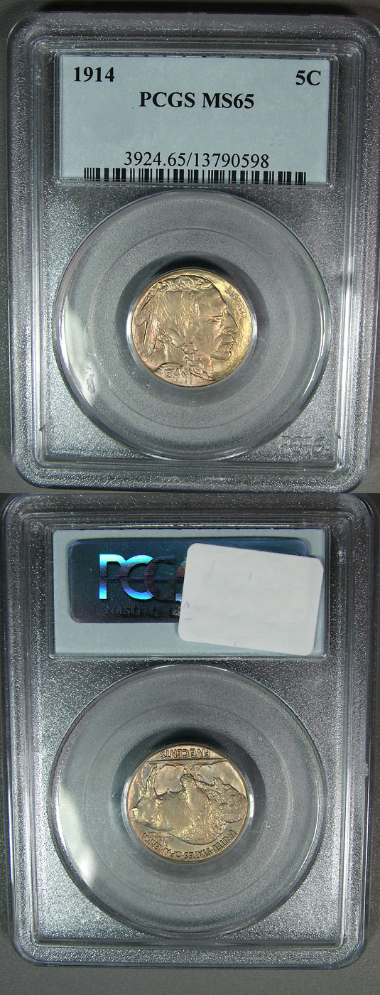 Flawless 1914 PCGS MS65 Buffalo Nickel is highly lustrous and beautifully toned in warm gold and pastel hues. Eye appeal is off the charts! Keenly struck devices swim in problem free fields. Coin is PQ and choice in every way.