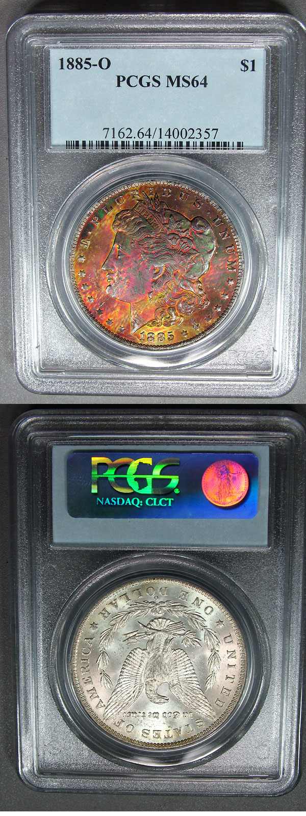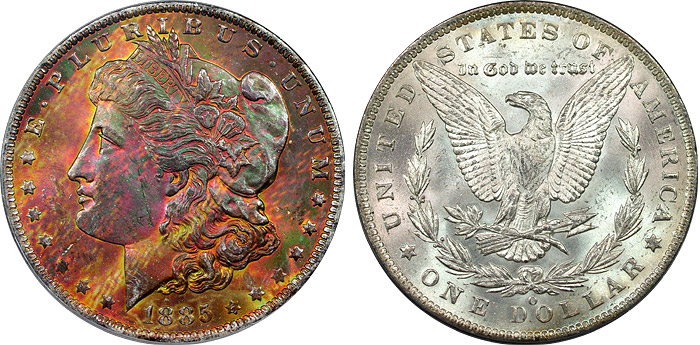 1885-O $1 PCGS MS64 Burning Beehive Textile Rainbow Morgan