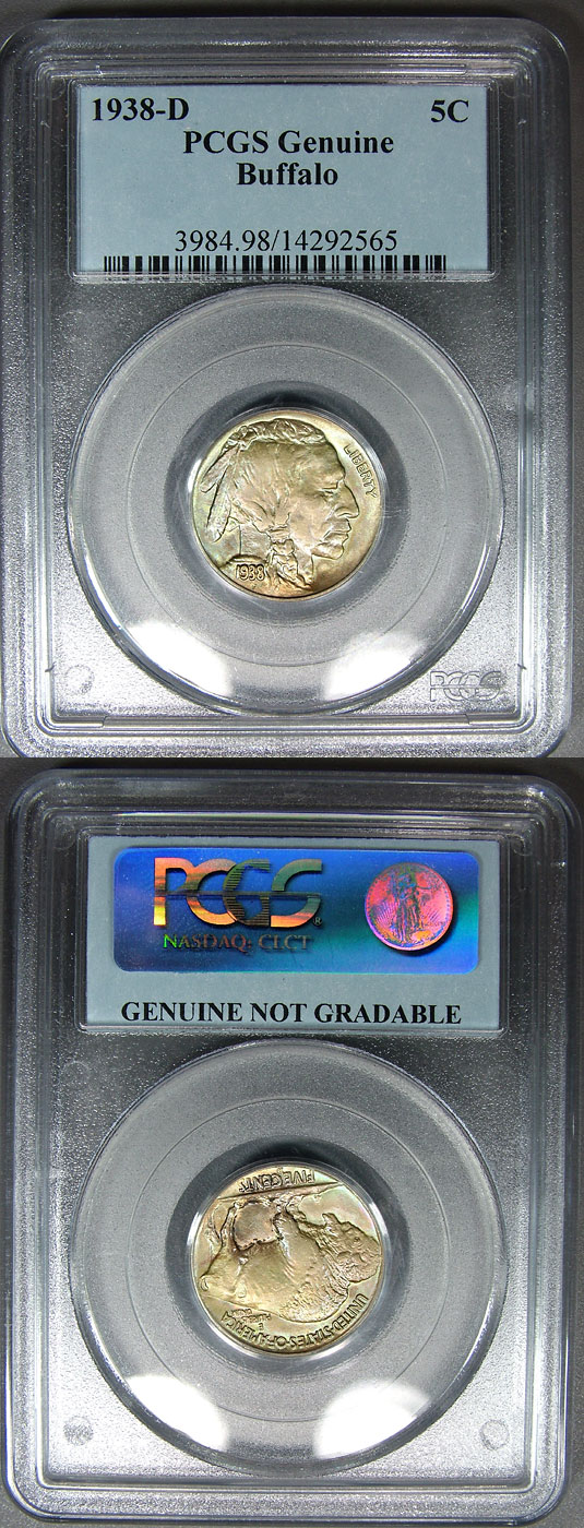This attractively toned Buffalo Nickel exhibits lime green shades intermingled with pastel pink and ice blue on both the obverse and reverse. PCGS assigned a "genuine" grade to this coin, not because of the color, but because of damage, not because of the color. You can verify this by checking the PCGS site for the certification verification by clicking this link: http://www.pcgs.com/Cert/14292565.html