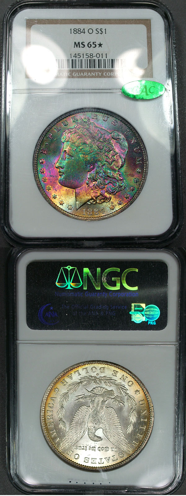 1884-O $1 NGC MS65* CAC Boldly Toned Rainbow Morgan