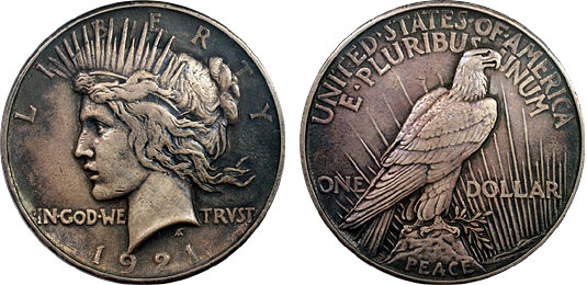 PCGS deemed this one a 97 (Environmental Damage). I think they were a bit harsh. I''m not sure where they got the Environmental Damage from but it''s probably the deep toning over the surfaces revealing a touch of luster beneath. I didn''t really buy this one for a monster grade. I buy all the 1921 Peace dollars I can that exhibit superb strikes. This one displays very well struck devices and central detail with full split hair over Liberty''s ear and fully struck feathers on the Eagle''s shoulder on the reverse (they''ve been worn down from circulation a touch though).