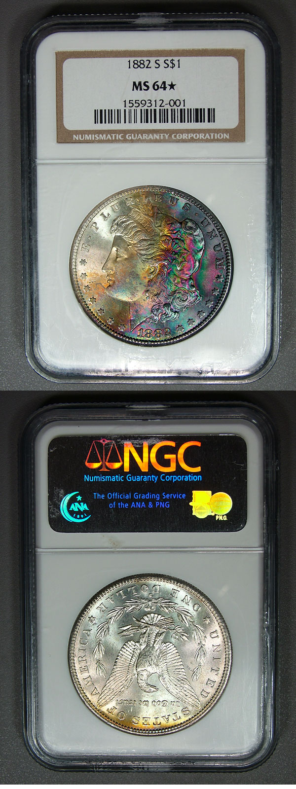 1882-S $1 NGC MS64* STAR Banded Rainbow Toned Morgan