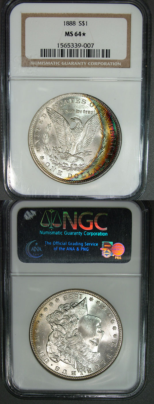 1888 $1 NGC MS64* STAR Banded Rainbow Toned Morgan
