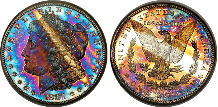 This famous Morgan dollar is wonderfully known as the "Lightning Bolt" for obvious reasons. This is not youre typical toned morgan dollar as it is generally agreed upon by experts that the toning occured as if it were stored amonst and in the same fashion as other proof coins of the period. The toning pattern very closely resembles the toning on, but much nicer than, proof coins stored in tissue and possibly in wooden coin cabinets back when that form of storage was acceptable for numismatic items. Considering the fact that the coin is very prooflike, this explaination is the most plausible. However the case, this is universally considered to be one of the finest toned morgans in existence.