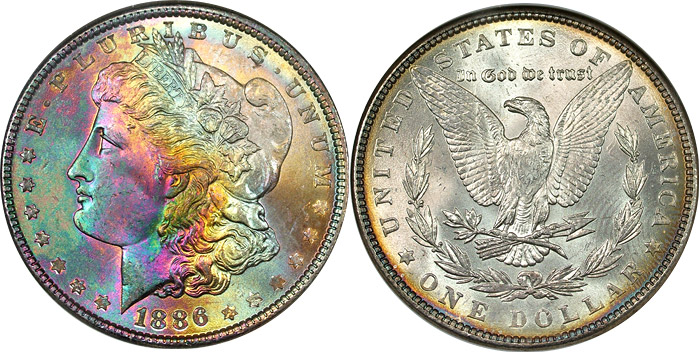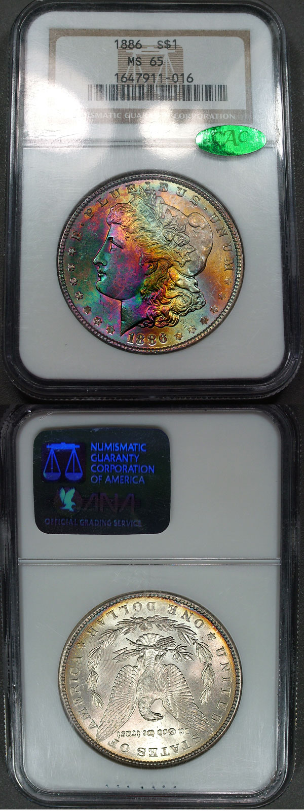 1886 $1 NGC MS65 CAC Beautiful Gem Rainbow Morgan