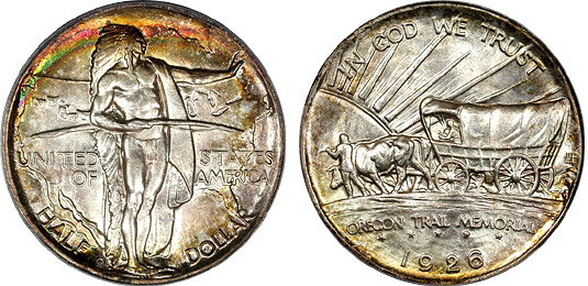 A bold wave of emerald green, burgandy, and yellow-gold flows across the upper obverse of this intensely lustrous and eye appealing Superb Gem Oregon Commemorative. The reverse is essentially untoned with save for some light gold at the rims.