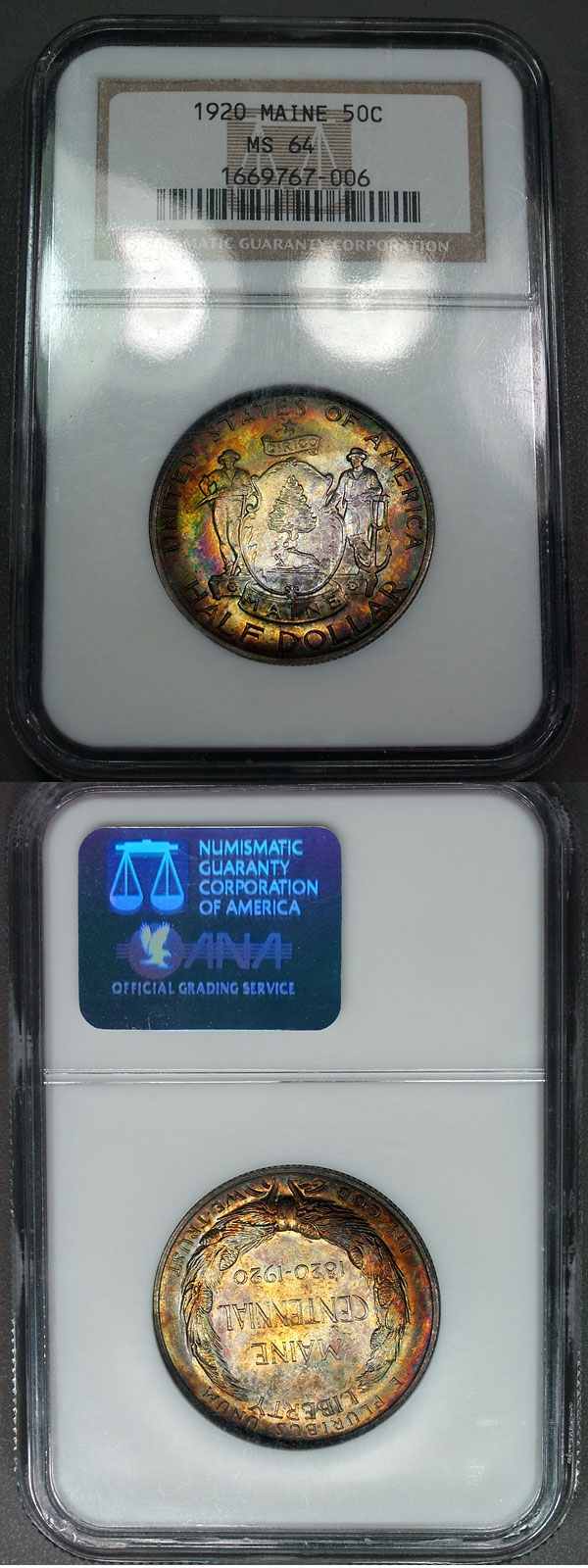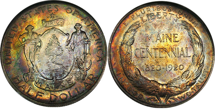 Completely toned on both the obverse and reverse, this Maine Commemorative features mossy gold dominant hues accompanied by lime, pumkpin orange, hints of blue and purple. On the reverse variegated shades similar to the obverse with light yellow and icy blue thrown into the mix. A lovely coin.