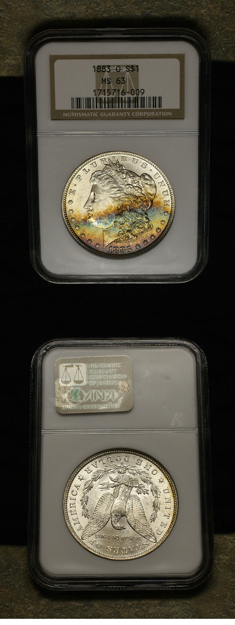 This lovely Morgan dollar exhibits a banded rainbow across the lower obverse. This coin was graded by NGC an MS63 and has the certication number of 171571609.