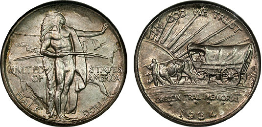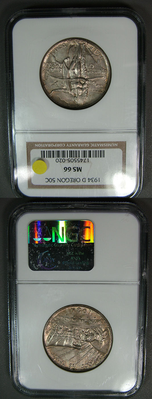 Well struck 1934-D 50c NGC MS66 Oregon Commemorative Half Dollar. Motifs are sharp and well defined. Nice luster highlights pretty rusted gold toning. Pleasing.