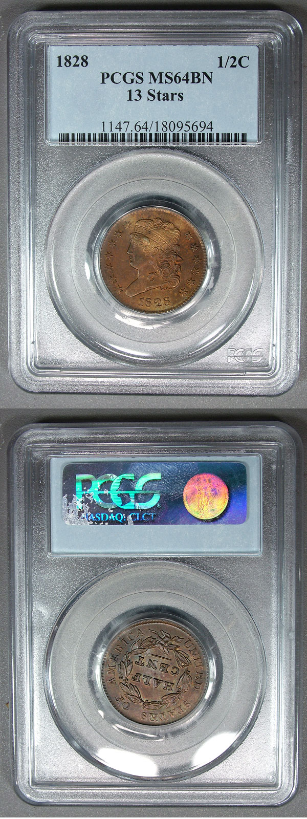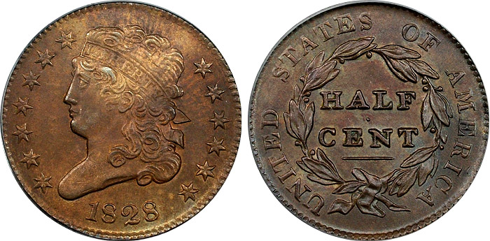 1828 1/2c PCGS MS64BN Classic Head Half Cent - 13 Stars