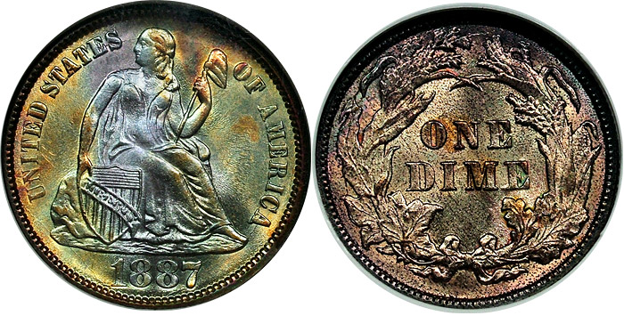 1887 10c NGC MS66 CAC Stunning Toned Seated Liberty Dime