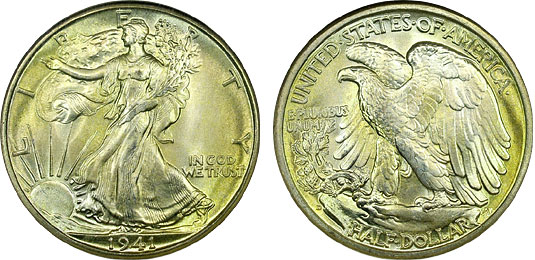 Marvelously lustrous and enveloped in a cartwheel aurora of vivid yellow tinted with very light lime. A typical example of this date typically sells for around $700. However, I can walk down to any coin shop or any coin show and pick up a 1941-D Walker in MS67. I could look for quite some time and still not find one with the striking eye appeal of this example. Think about it.