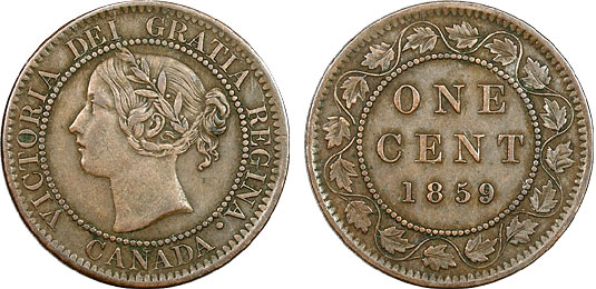 The young head Victorian coins, struck in 1858 and 1859 prior to Confederation, are British Colonial issues under the Province of Canada. The denomination of a cent is equal to the British 1/2 penny, but the government had them struck to the weight standard of 100 coins to the pound rather than the the British standard of 80 coins to the pound of bronze. This made the coins unpopular and poorly accepted by the public.