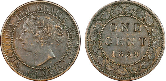 The young head Victorian coins, struck in 1858 and 1859 prior to Confederation, are British Colonial issues under the Province of Canada. The denomination of a cent is equal to the British 1/2 penny, but the government had them struck to the weight standard of 100 coins to the pound rather than the the British standard of 80 coins to the pound of bronze. This made the coins unpopular and poorly accepted by the public.
