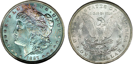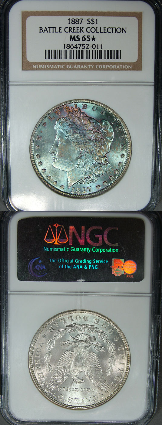 1887 $1 NGC MS65* Ice Blue - Pink Textile Toned Morgan