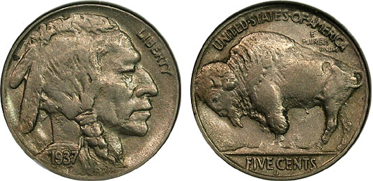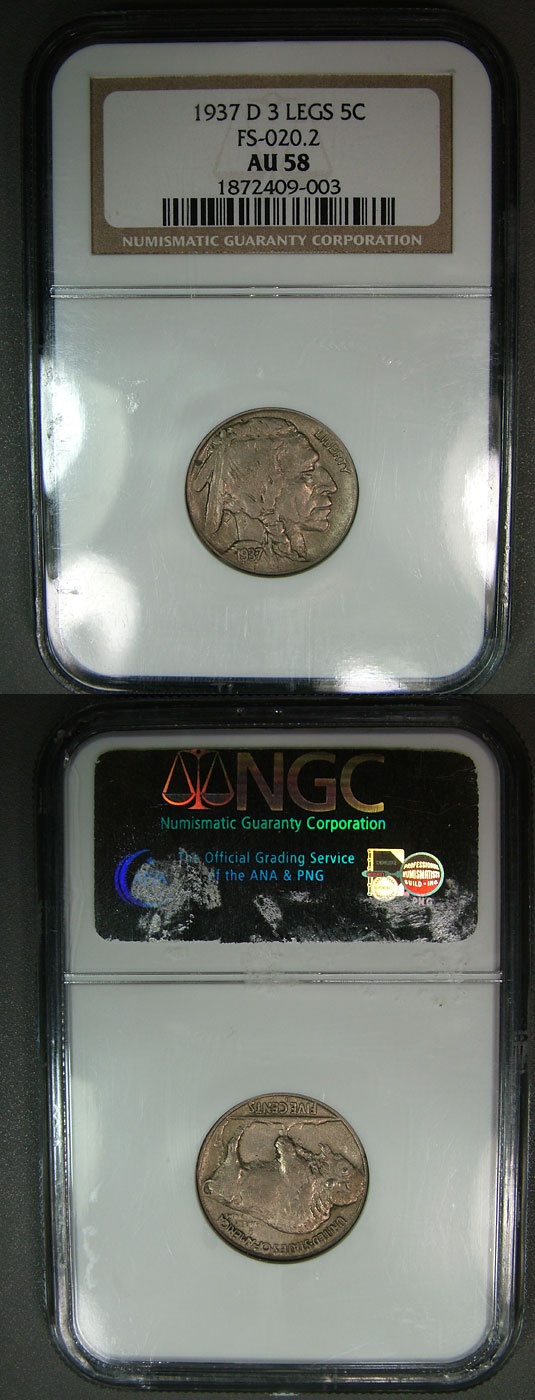 1937-D 5c NGC AU58 Three Legged Buffalo Nickel