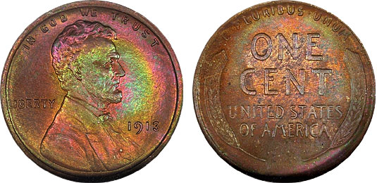 This outstanding Lincoln cent is enblazened with powerful rainbow tones in a target pattern over the beautifully textured early date Lincoln cent fields. This is a stunningly beautiful Lincoln cent that will certainly please the new owner.